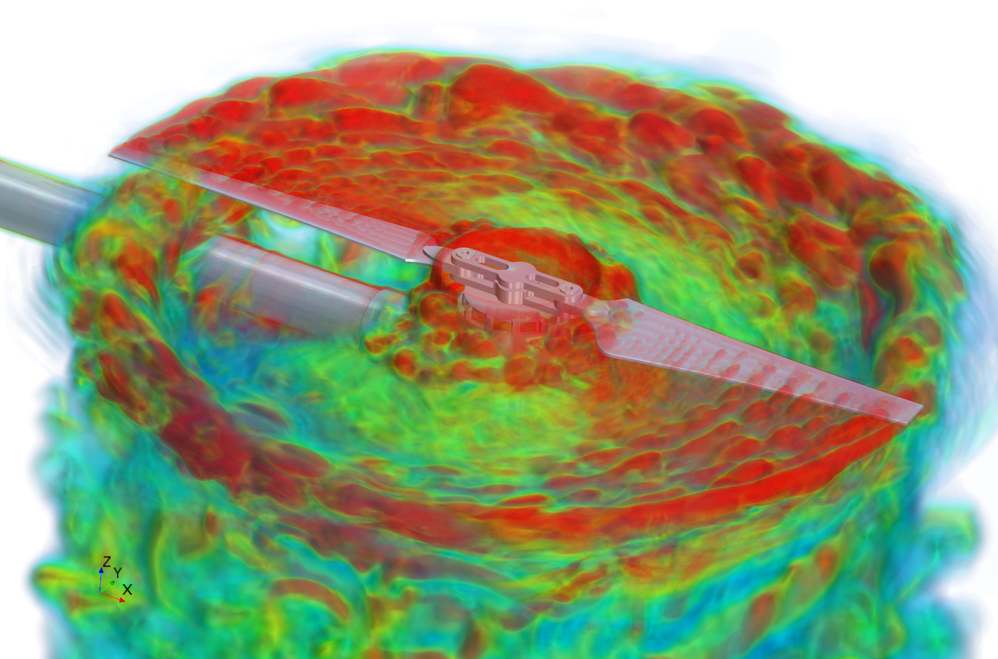 This figure shows the vortices shedding from the rotating blades,